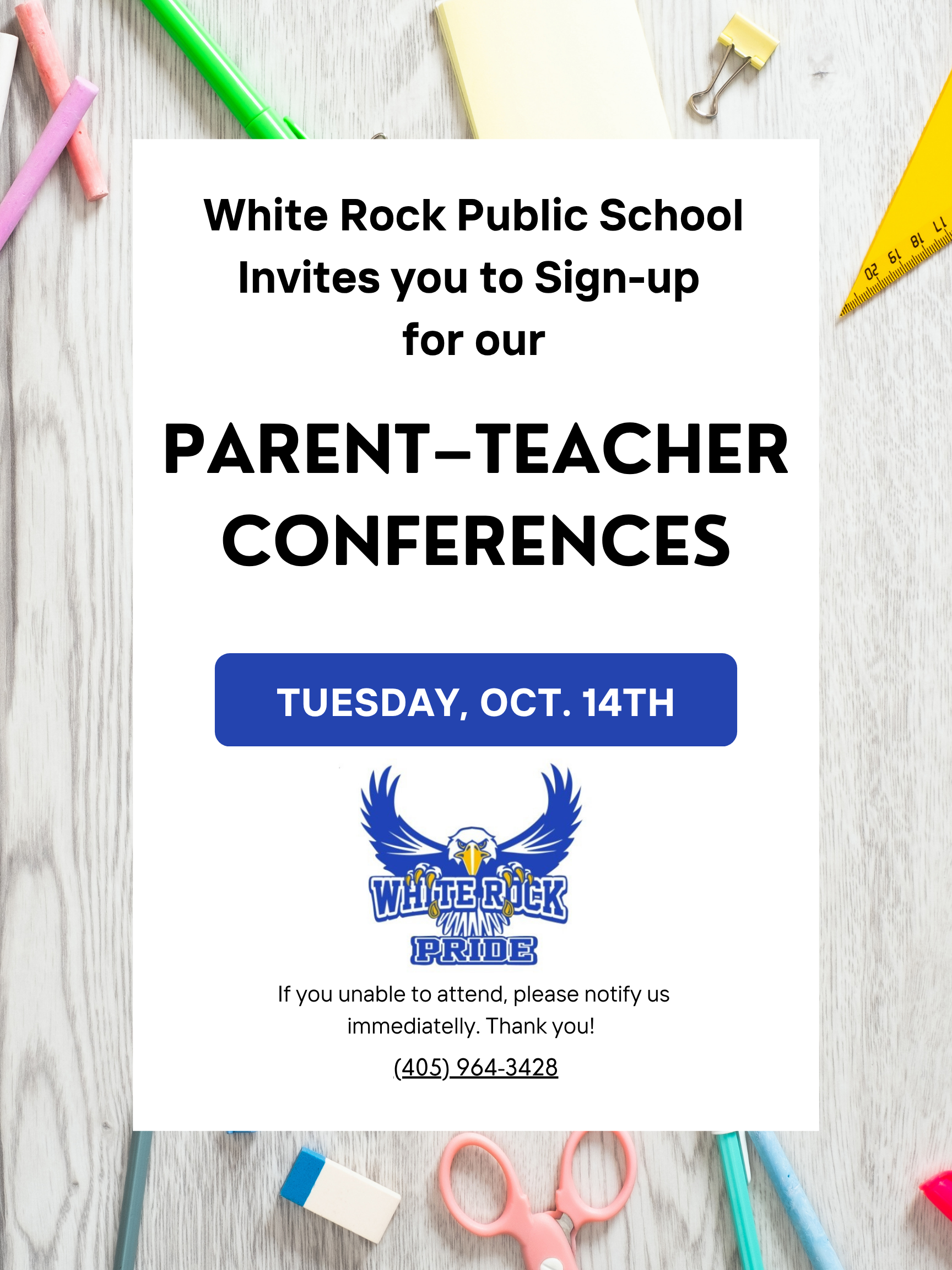 Hello White Rock Families,We are happy to welcome all parents and guardians to this year's parent-teacher conferences. You will sign up on ParentSquare this year. It's easy. Look at the times avail...